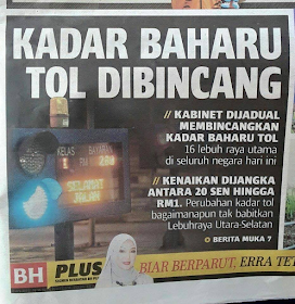 Pada November tahun lalu, kerajaan memutuskan menangguhkan kenaikan kadar tol bagi 20 lebuh raya di seluruh negara yang sepatutnya dinaikkan tahun ini